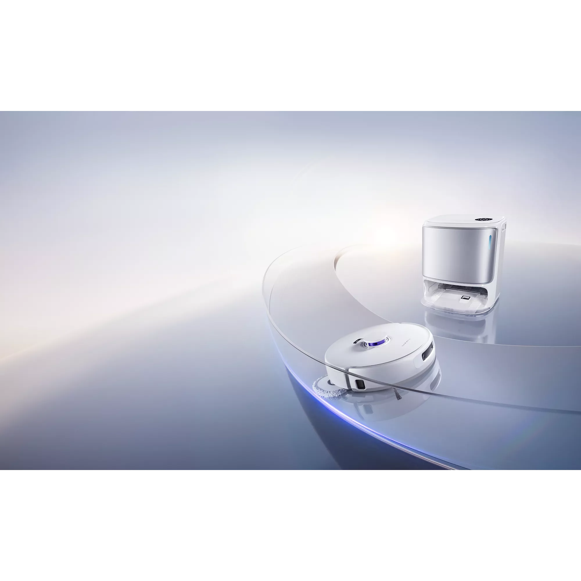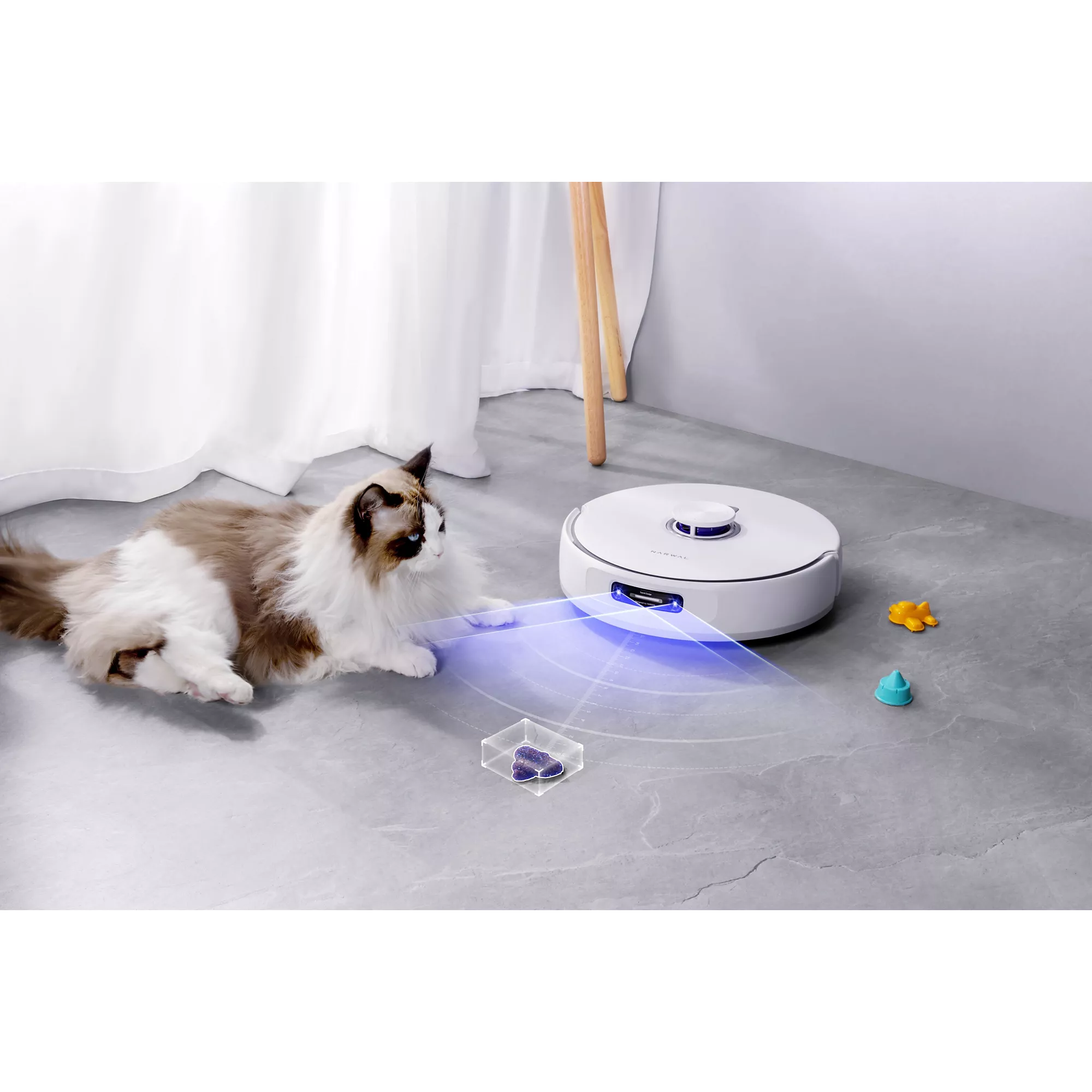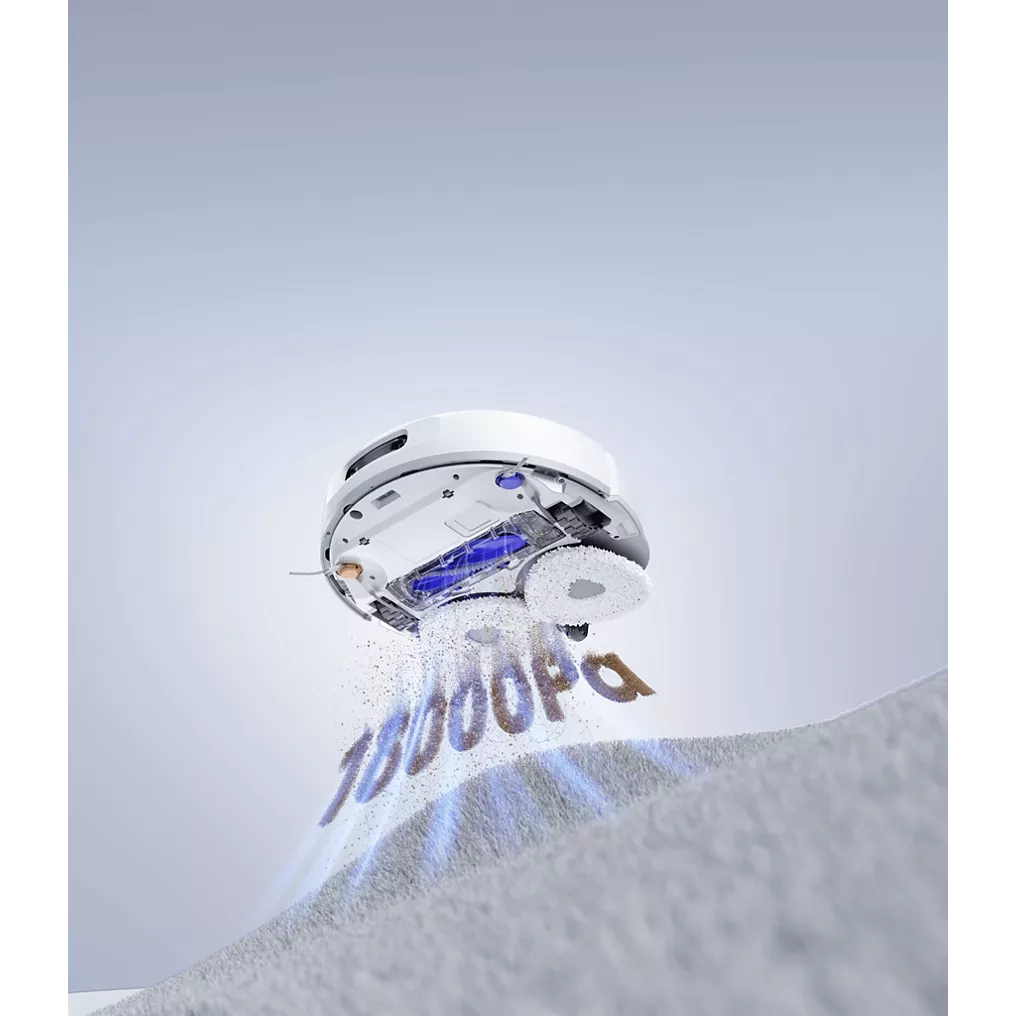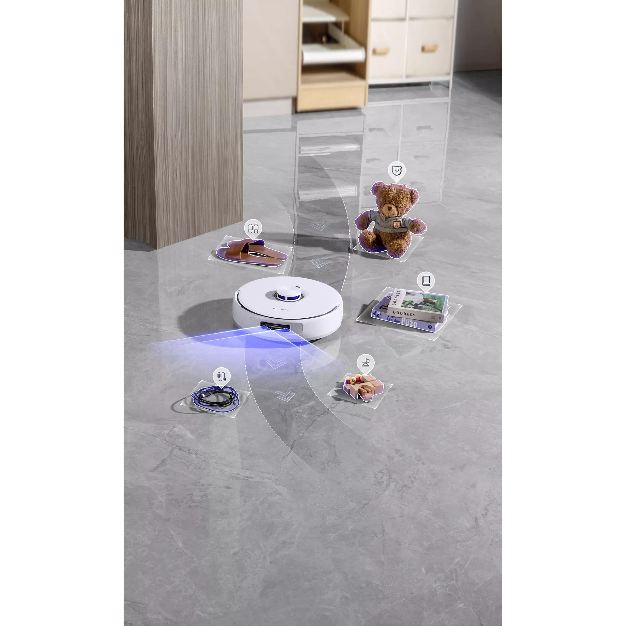 - Serpillère déportée : le robot est capable de nettoyer plus efficacement les angles et bords des murs en déployant sa serpillière vers l’extérieur.