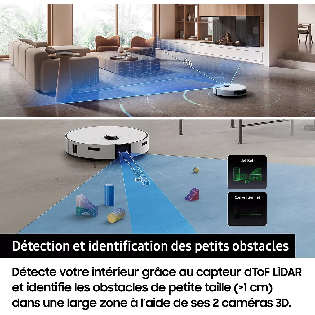 - Detection des objets en temps réel : Détection et reconnaissance précise des objets (1 cm), ne s’emmêle pas dans les câbles et évite les obstacles les plus petits