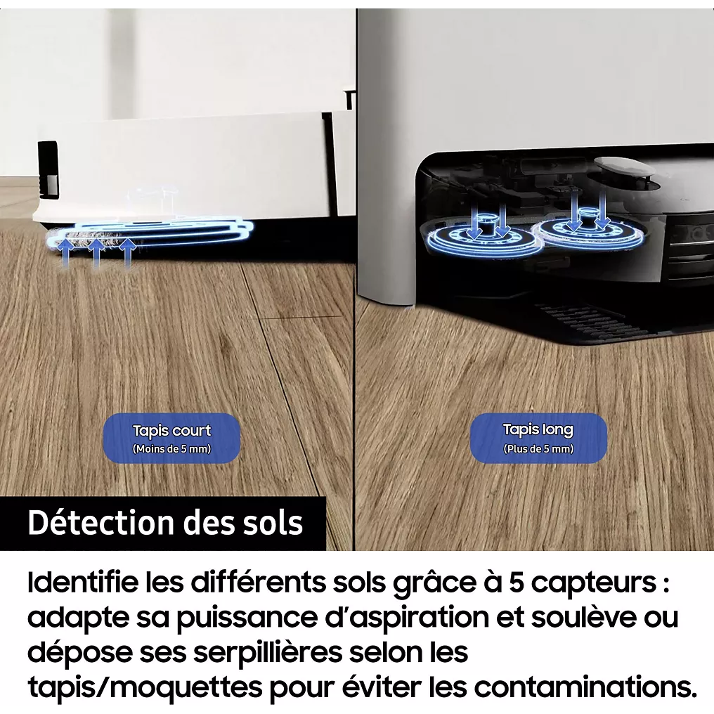 Caractéristiques complémentaires - Lavage automatique des serpillières à l’eau chaude pour une meilleure qualité de nettoyage. Séchage automatique des serpillières, pour éviter les bactéries et odeurs. Désinfection vapeur : après le lavage des serpillières, de la vapeur est pulvérisée sur celles-ci pour les désinfecter. Détection automatique des sols : le robot identifie les types de sols, adapte sa puissance d’aspiration et soulève ou dépose ses serpillières à la station selon les tapis/moquettes pour éviter leur contamination. Détection et reconnaissance précise des objets (1 cm), ne s’emmêle pas dans les câbles et évite les obstacles les plus petits.