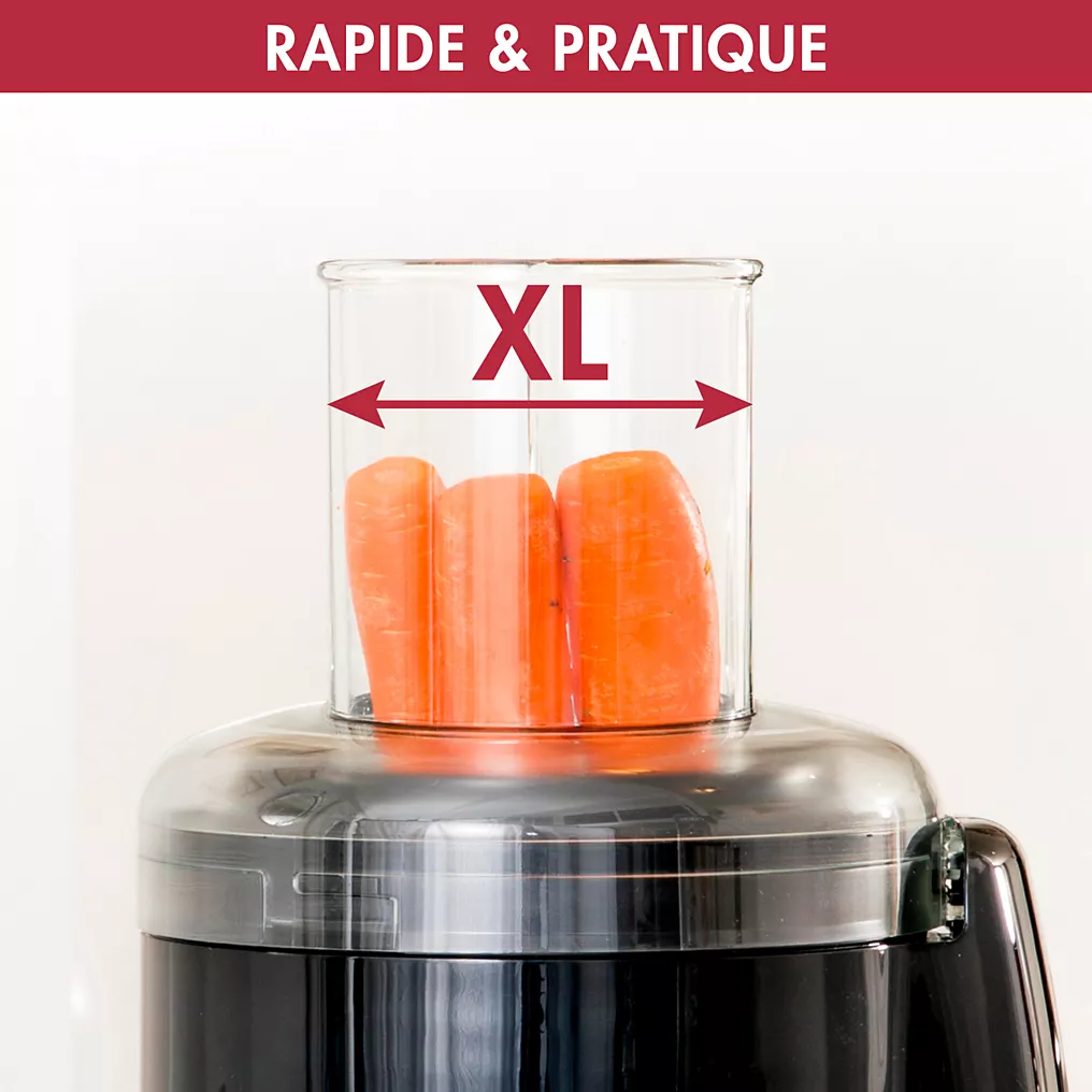 Le Juice Expert 4 est conçu pour être simple d’utilisation. Il intègre une goulotte large, permettant d’introduire des fruits ou légumes entiers ou en gros morceaux, réduisant ainsi le temps de préparation. Le jus s’écoule directement dans le verre ou le récipient, sans transfert intermédiaire, ce qui rend l’utilisation rapide et pratique.